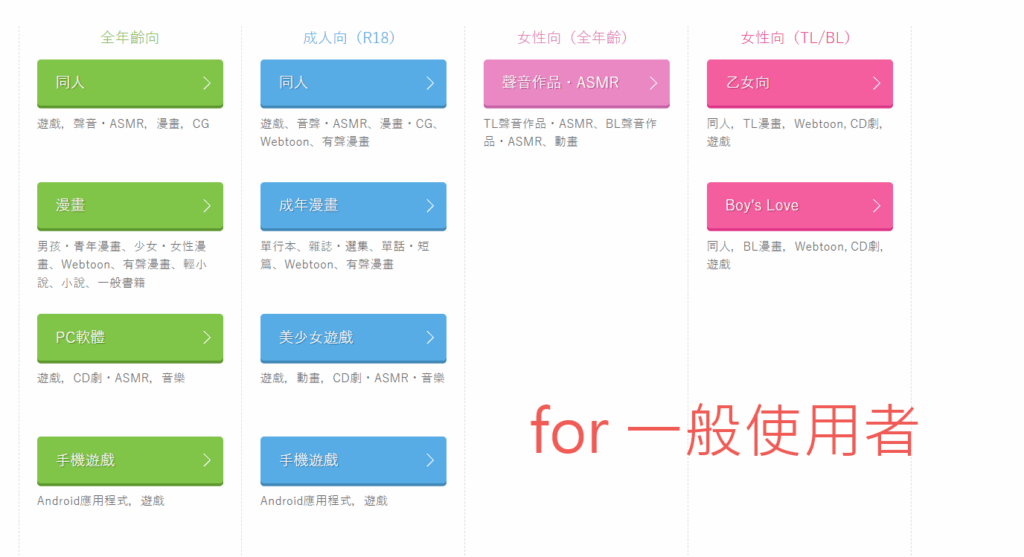 DLsite是日本最大的內容電商網站,販售的作品類型除了常見的小說、漫畫、遊戲以外,甚至還包含聲音類,例如廣播劇、ASMR,其他還包含動畫,而且尺度極大,用戶數量眾多。