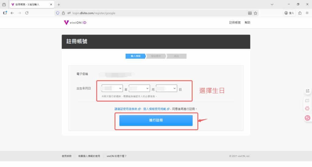 選擇出生年月日 → 按下”進行註冊”按鈕