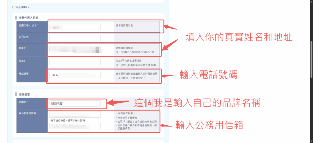 輸入姓名、地址、電話、社團名稱、信箱提醒一下,電話的部分預設會自動帶入+886,你只要將號碼無縫接軌就好。