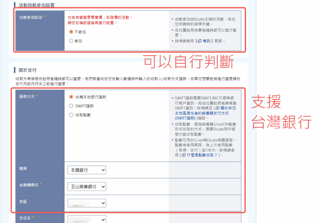 設定是否自動參加促銷活動、銀行資料銀行部分可以選擇的很多,包含農會、漁會、郵局也都可以。
