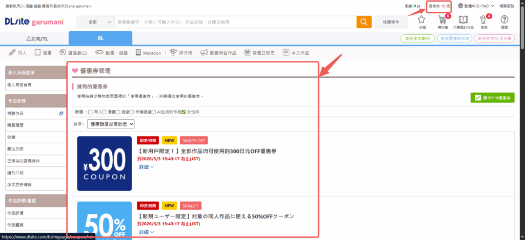 成功登入!成功登入之後,可以看一下優惠券的部分,贈送折扣很大,有興趣想買的話,可以把握新手註冊贈送的這些,都有使用期限限制,而且滿短的。